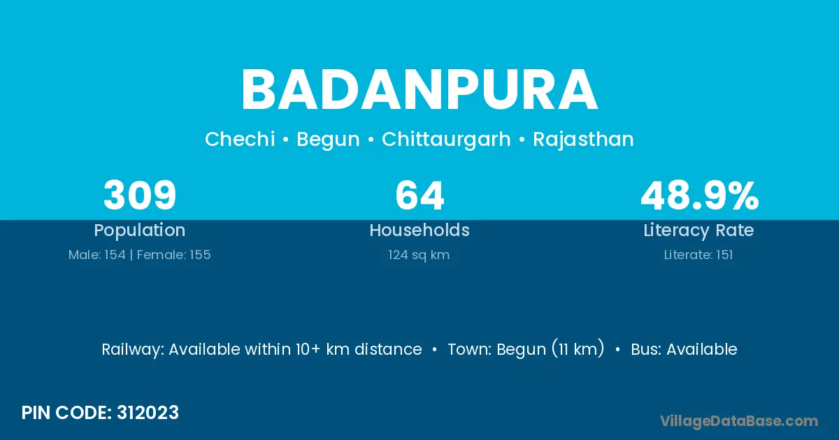Banswara (32 km) is the nearest town to Badanpura village for major economic activities and is located approximately 32 km away.