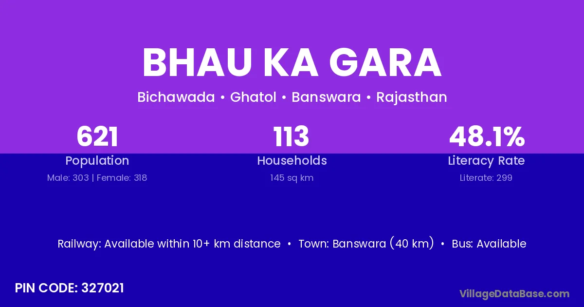 Bhau Ka Gara village has a total population of 621 people, of which 303 are males and 318 are females.