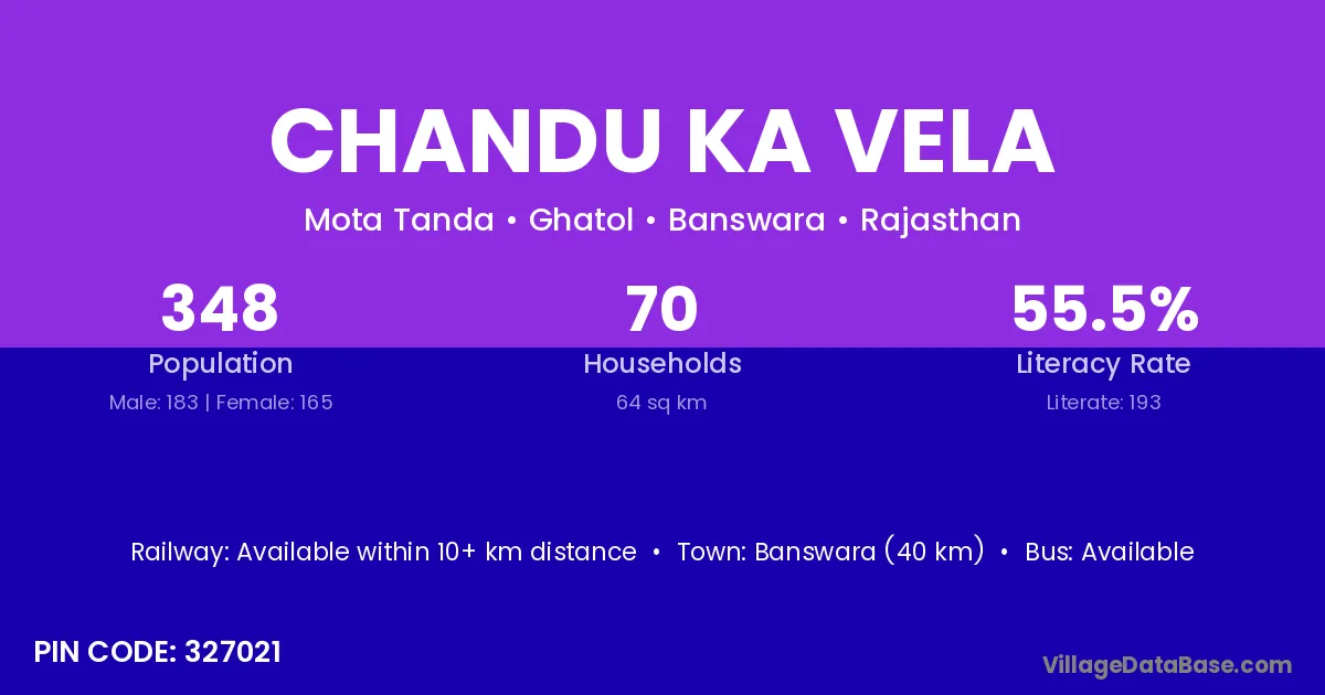 Chandu Ka Vela village has a total population of 348 people, of which 183 are males and 165 are females.