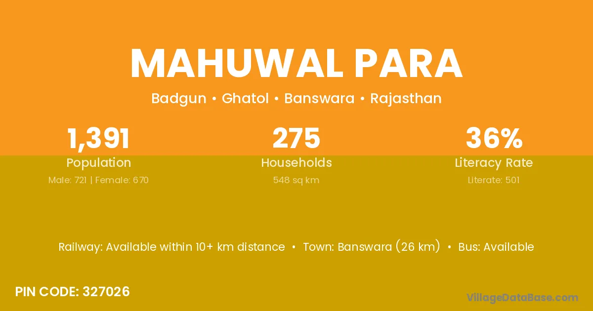 Banswara (26 km) is the nearest town to Mahuwal Para village for major economic activities and is located approximately 26 km away.