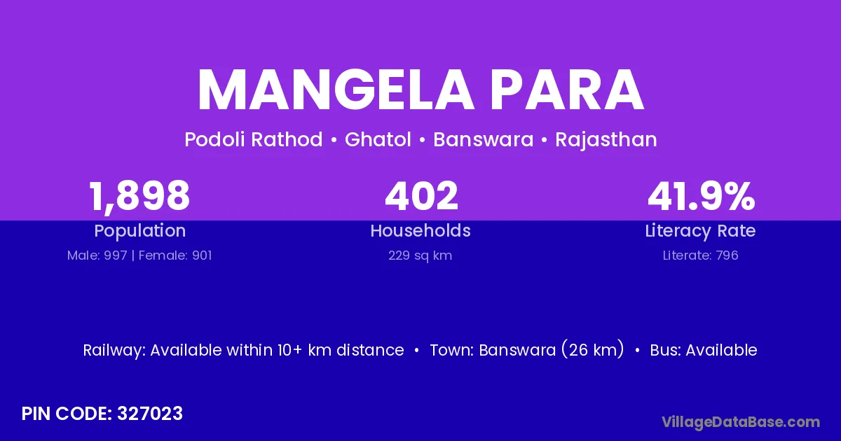 Banswara (26 km) is the nearest town to Mangela Para village for major economic activities and is located approximately 26 km away.