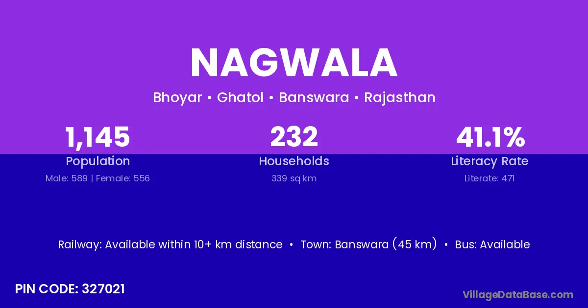 Banswara (45 km) is the nearest town to Nagwala village for major economic activities and is located approximately 45 km away.