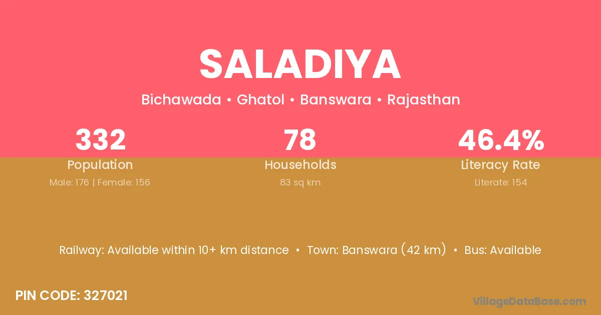 Banswara (42 km) is the nearest town to Saladiya village for major economic activities and is located approximately 42 km away.