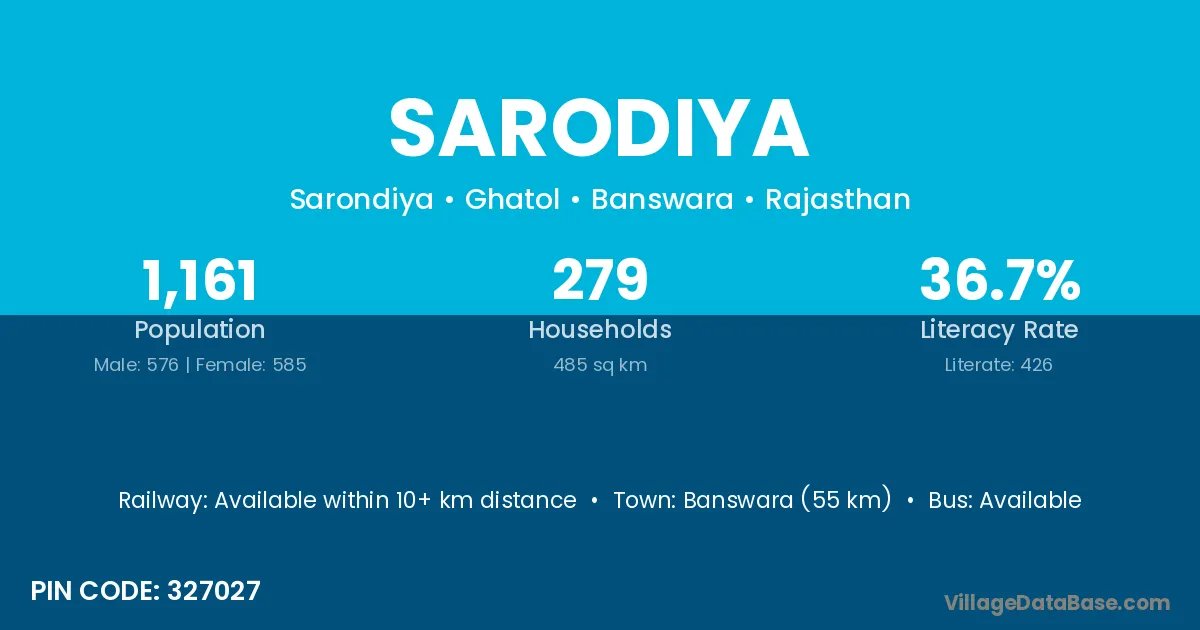 Banswara (55 km) is the nearest town to Sarodiya village for major economic activities and is located approximately 55 km away.