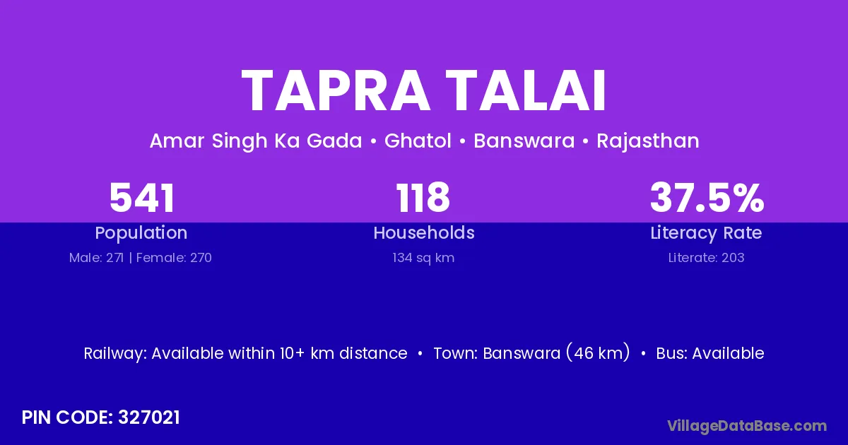 Banswara (46 km) is the nearest town to Tapra Talai village for major economic activities and is located approximately 46 km away.