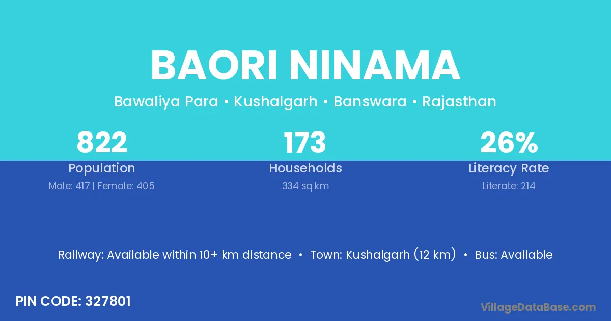 Kushalgarh (12 km) is the nearest town to Baori Ninama village for major economic activities and is located approximately 12 km away.