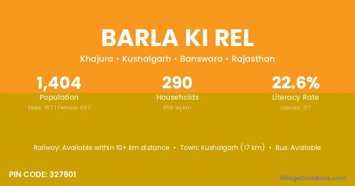 Kushalgarh (17 km) is the nearest town to Barla Ki Rel village for major economic activities and is located approximately 17 km away.