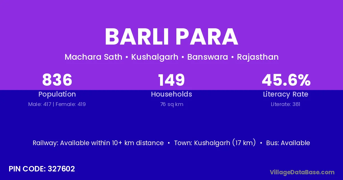 Kushalgarh (17 km) is the nearest town to Barli Para village for major economic activities and is located approximately 17 km away.
