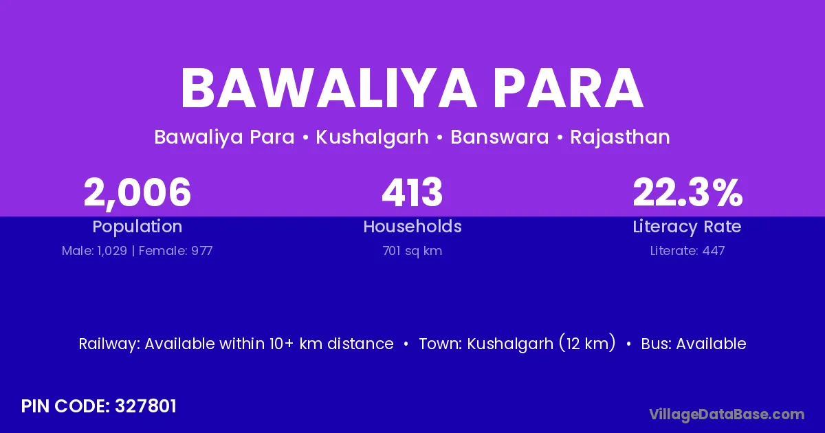 Kushalgarh (12 km) is the nearest town to Bawaliya Para village for major economic activities and is located approximately 12 km away.