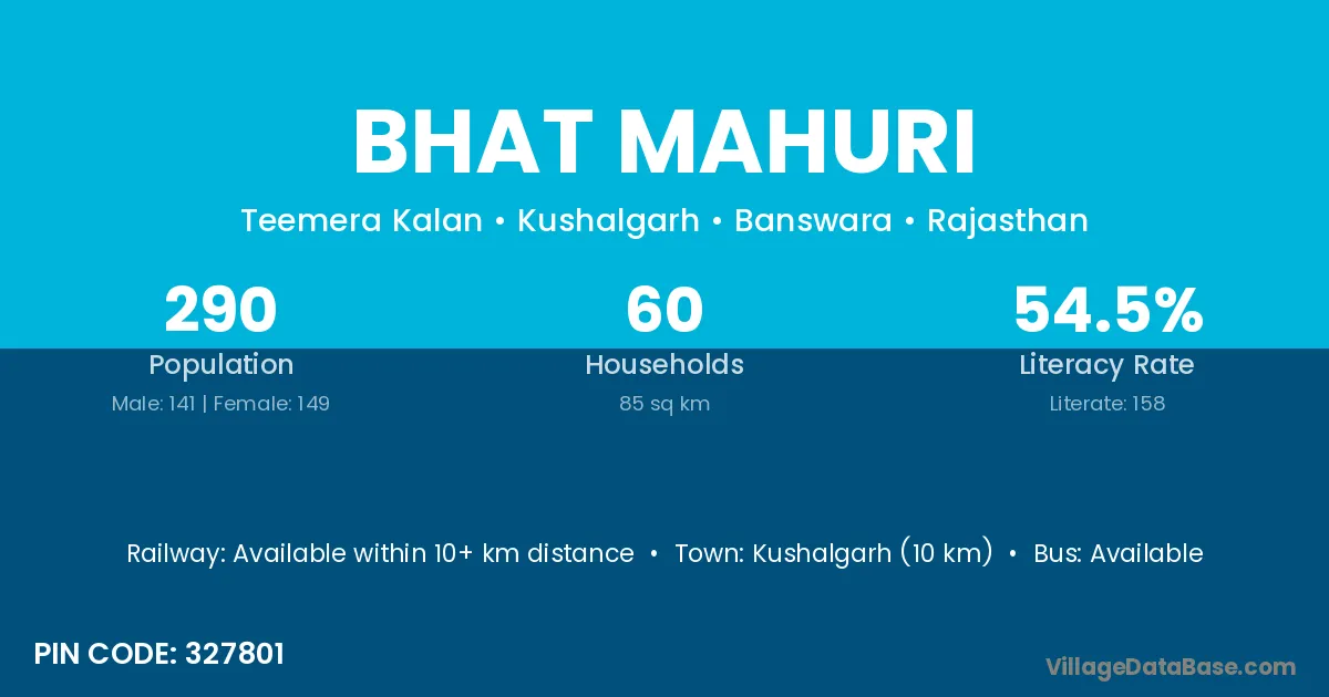 Kushalgarh (10 km) is the nearest town to Bhat Mahuri village for major economic activities and is located approximately 10 km away.