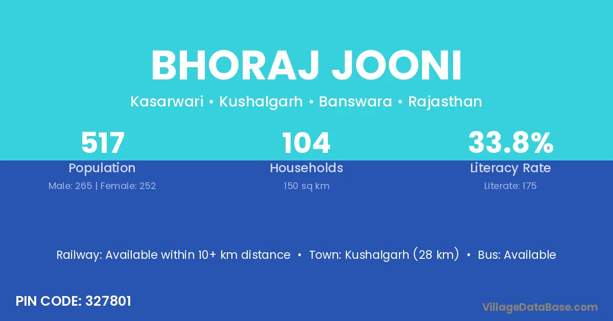 Kushalgarh (28 km) is the nearest town to Bhoraj Jooni village for major economic activities and is located approximately 28 km away.