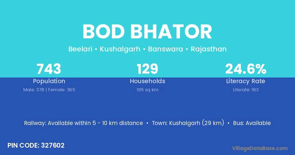 Kushalgarh (29 km) is the nearest town to Bod Bhator village for major economic activities and is located approximately 29 km away.