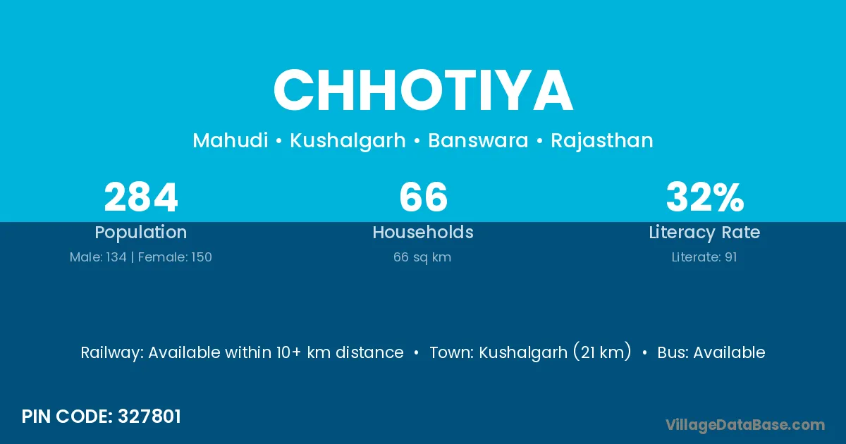 Kushalgarh (21 km) is the nearest town to Chhotiya village for major economic activities and is located approximately 21 km away.