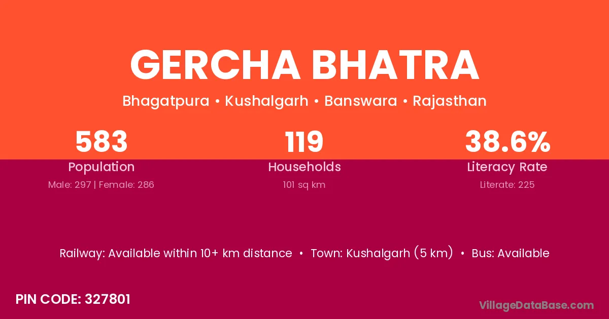Kushalgarh (5 km) is the nearest town to Gercha Bhatra village for major economic activities and is located approximately 5 km away.
