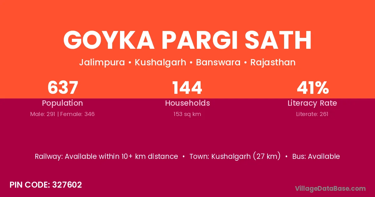 Kushalgarh (27 km) is the nearest town to Goyka Pargi Sath village for major economic activities and is located approximately 27 km away.