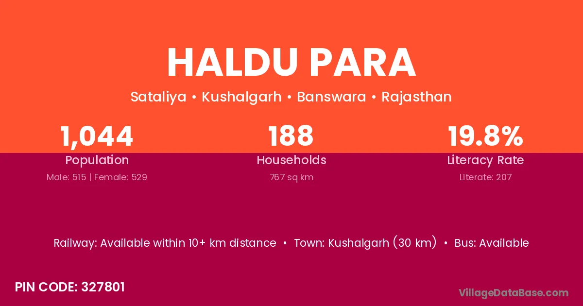 Kushalgarh (30 km) is the nearest town to Haldu Para village for major economic activities and is located approximately 30 km away.