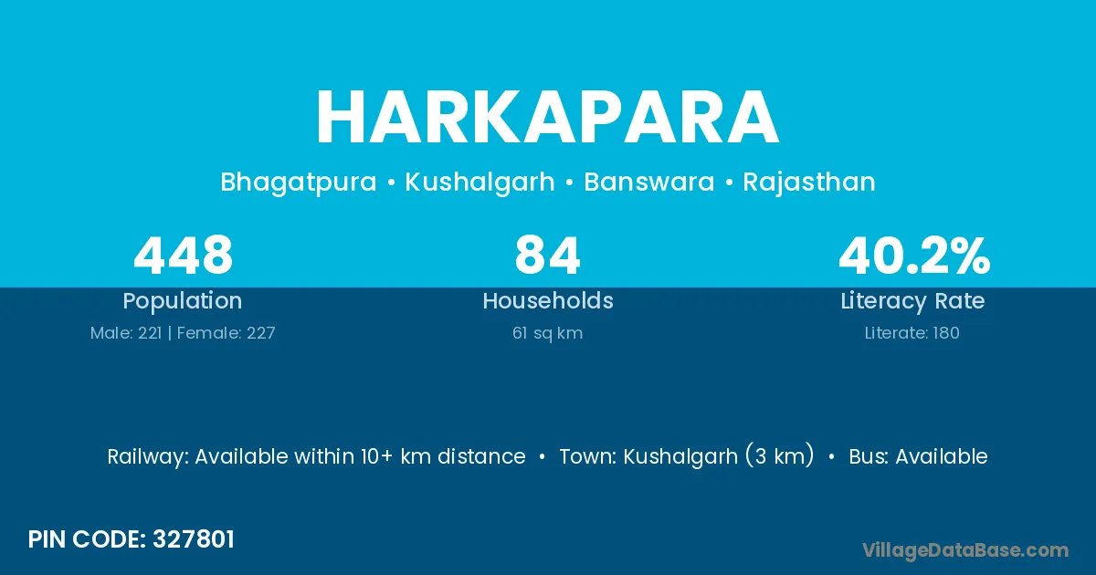 Kushalgarh (3 km) is the nearest town to Harkapara village for major economic activities and is located approximately 3 km away.