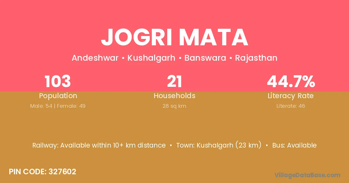 Kushalgarh (23 km) is the nearest town to Jogri Mata village for major economic activities and is located approximately 23 km away.