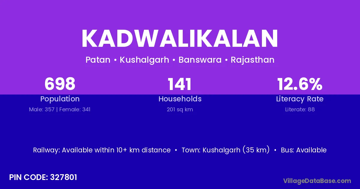 Kushalgarh (35 km) is the nearest town to Kadwalikalan village for major economic activities and is located approximately 35 km away.