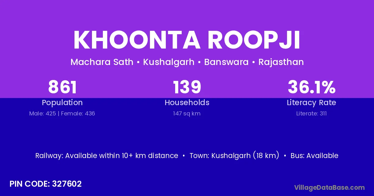 Kushalgarh (18 km) is the nearest town to Khoonta Roopji village for major economic activities and is located approximately 18 km away.