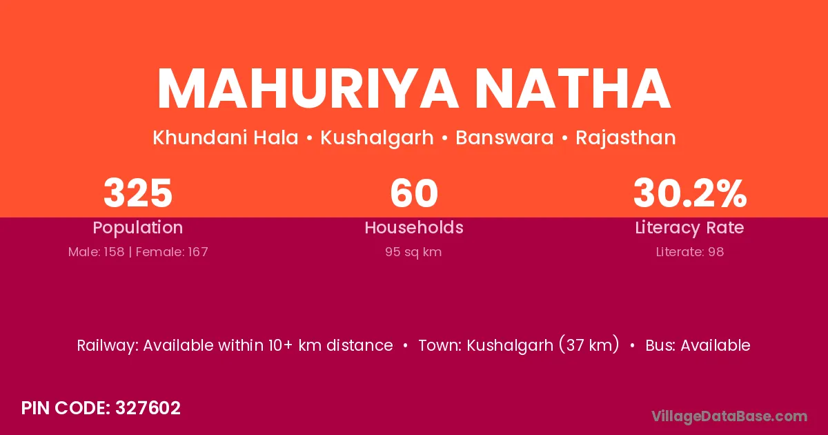 Kushalgarh (37 km) is the nearest town to Mahuriya Natha village for major economic activities and is located approximately 37 km away.