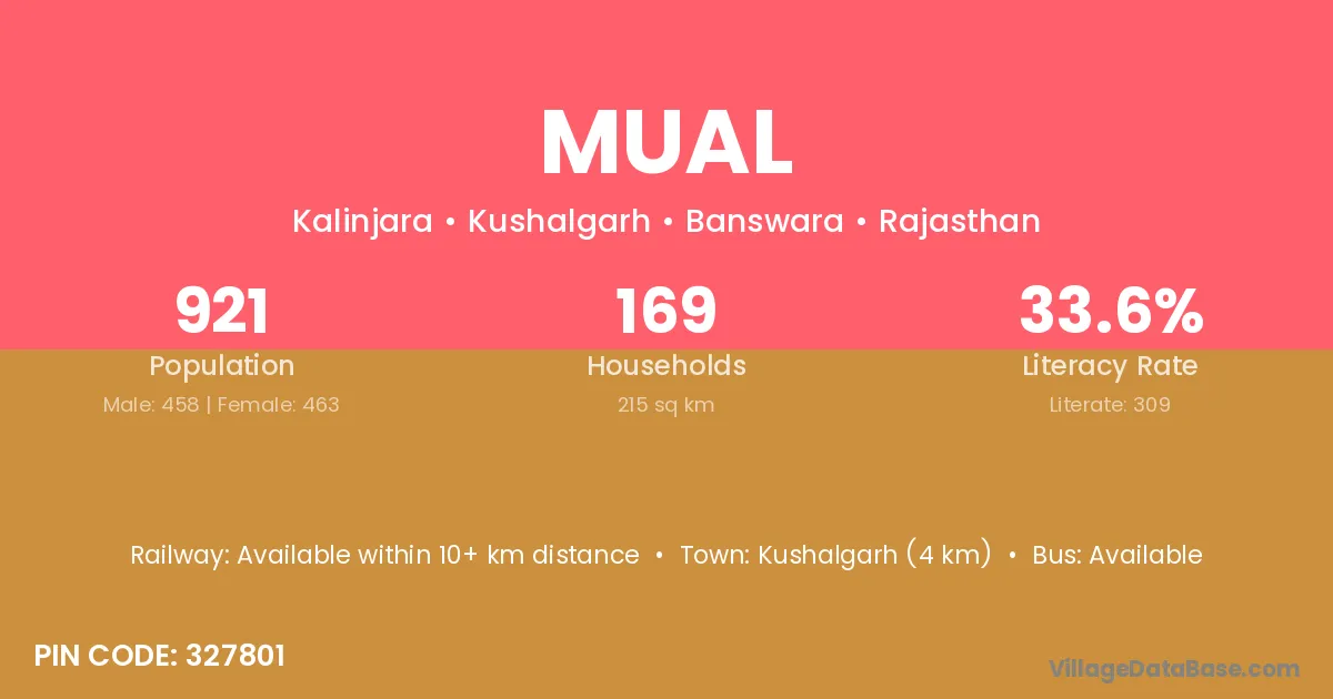 Kushalgarh (4 km) is the nearest town to Mual village for major economic activities and is located approximately 4 km away.