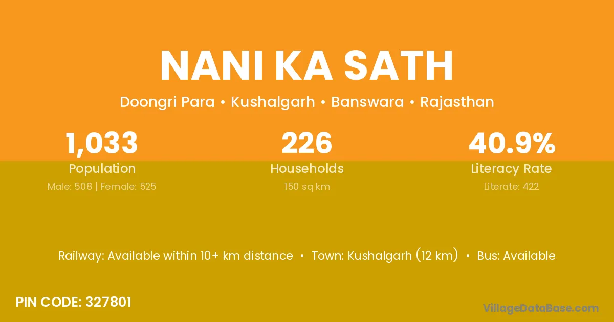 Kushalgarh (12 km) is the nearest town to Nani Ka Sath village for major economic activities and is located approximately 12 km away.