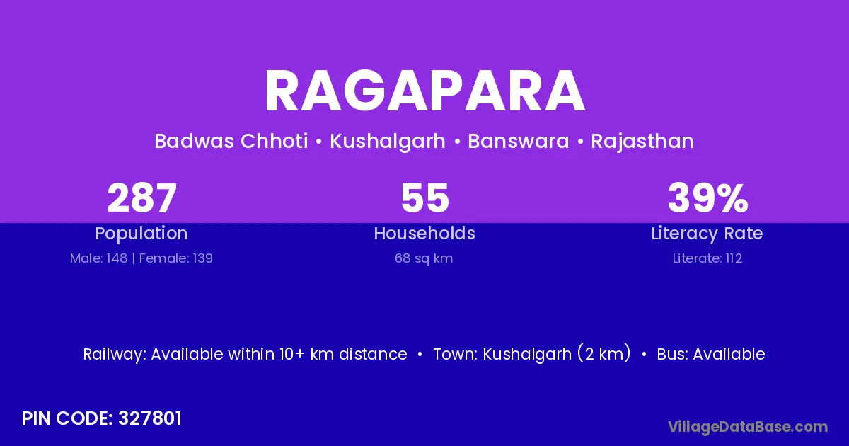 Kushalgarh (2 km) is the nearest town to Ragapara village for major economic activities and is located approximately 2 km away.