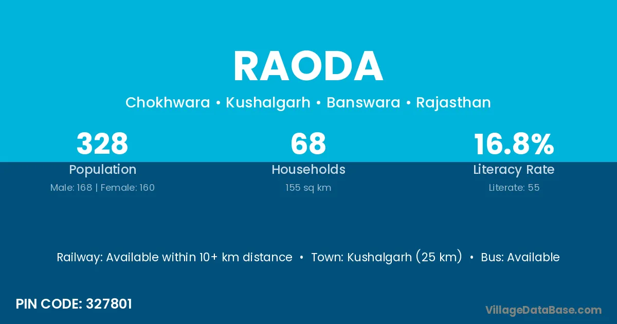Kushalgarh (25 km) is the nearest town to Raoda village for major economic activities and is located approximately 25 km away.