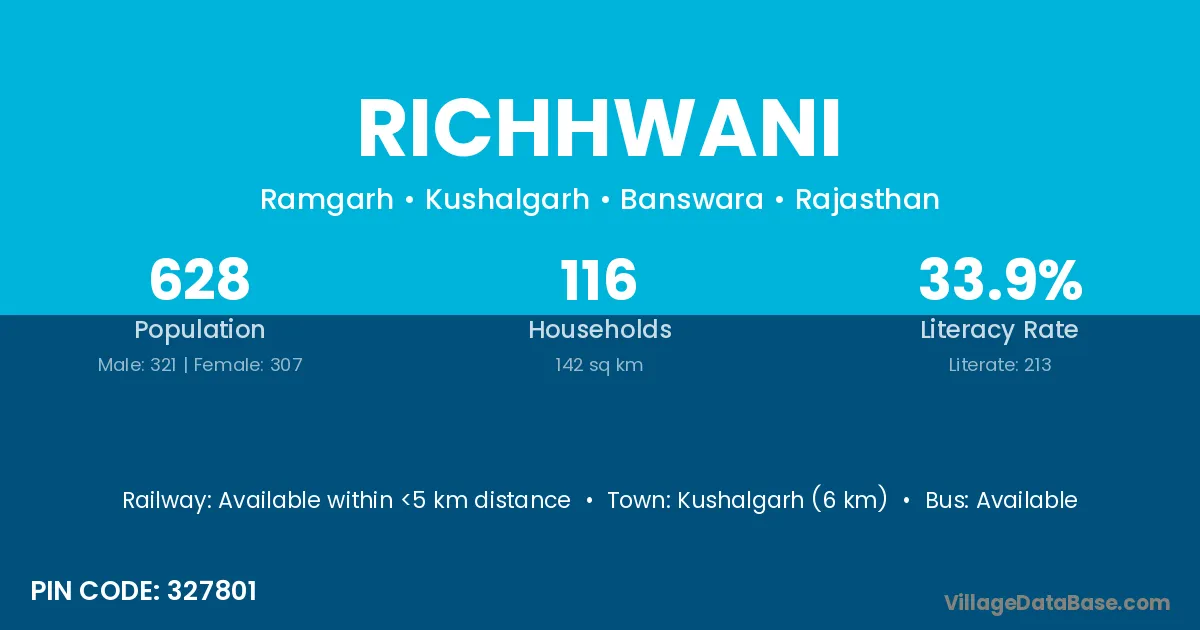 Kushalgarh (6 km) is the nearest town to Richhwani village for major economic activities and is located approximately 6 km away.