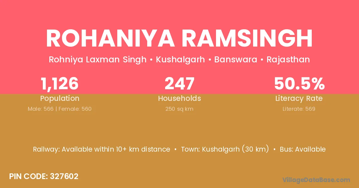 Kushalgarh (30 km) is the nearest town to Rohaniya Ramsingh village for major economic activities and is located approximately 30 km away.