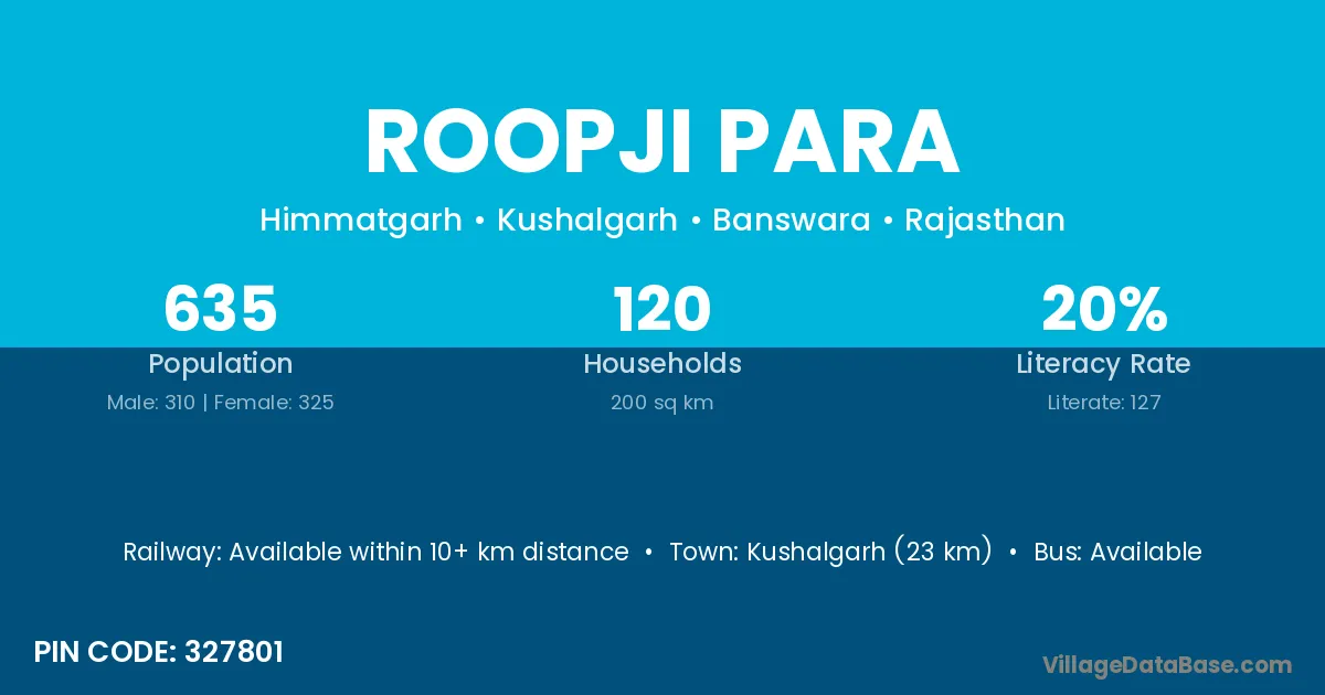 Kushalgarh (23 km) is the nearest town to Roopji Para village for major economic activities and is located approximately 23 km away.