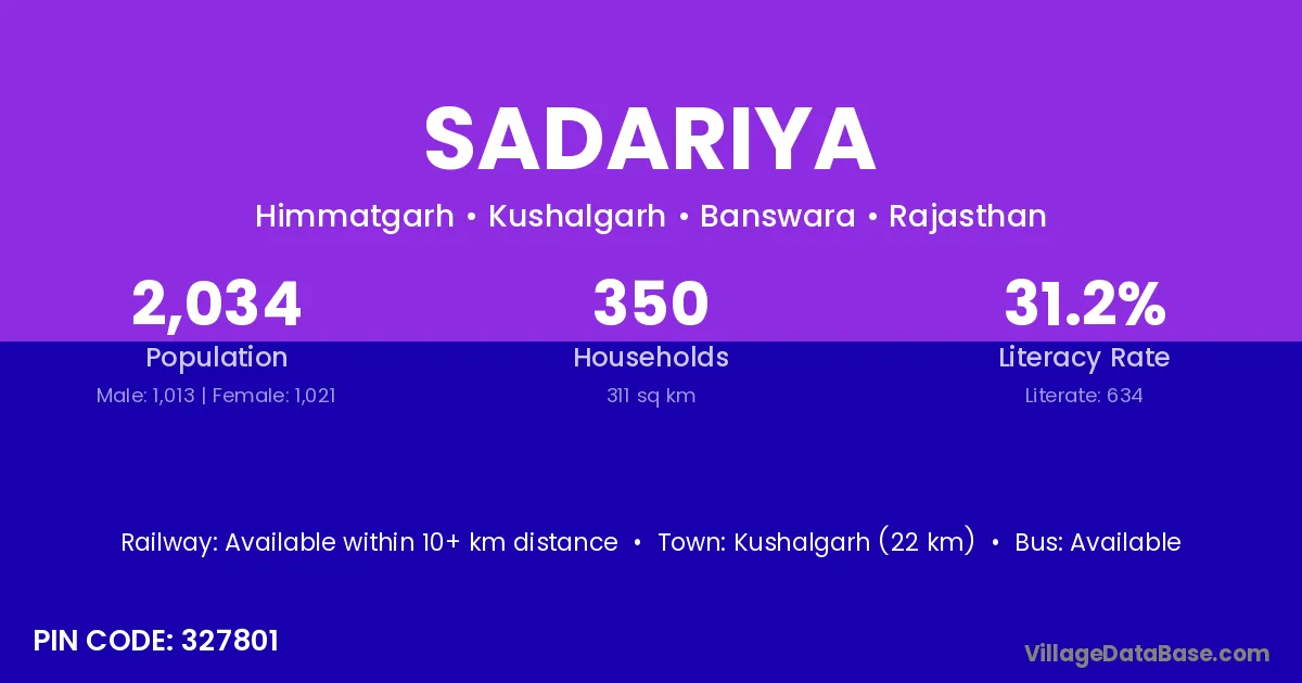 Kushalgarh (22 km) is the nearest town to Sadariya village for major economic activities and is located approximately 22 km away.