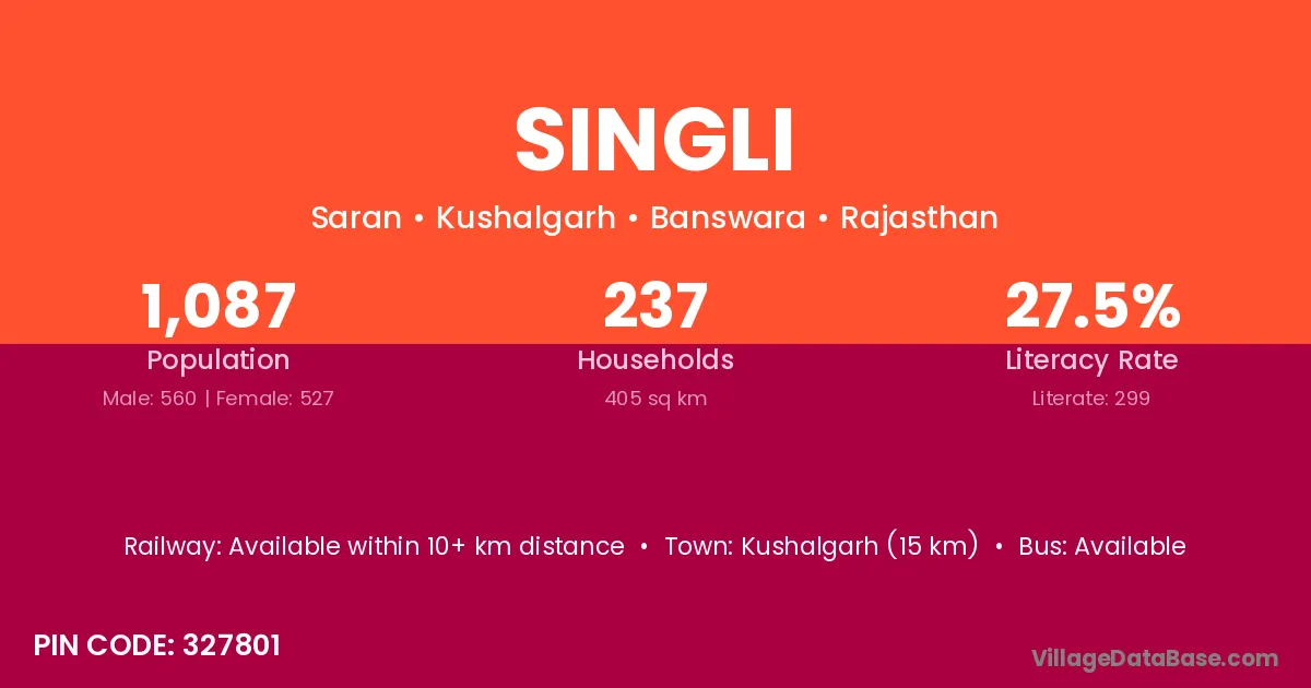 Kushalgarh (15 km) is the nearest town to Singli village for major economic activities and is located approximately 15 km away.