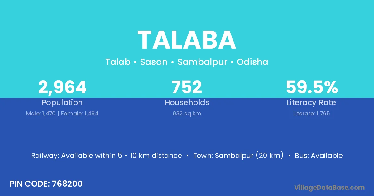 Kushalgarh (15 km) is the nearest town to Talaba village for major economic activities and is located approximately 15 km away.