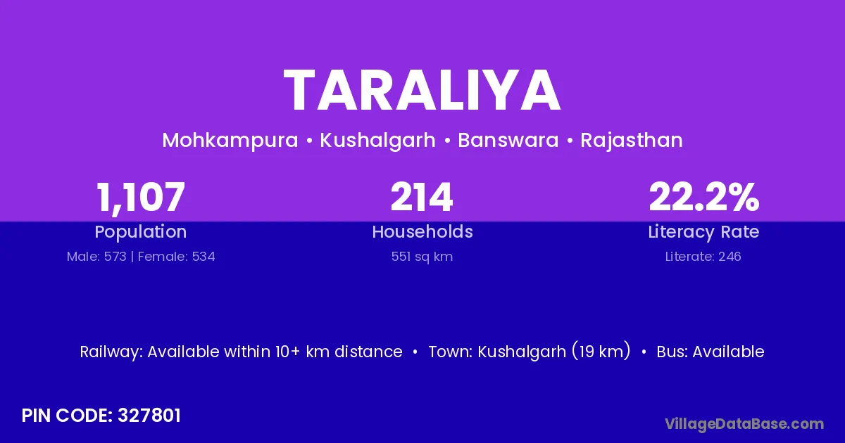 Kushalgarh (19 km) is the nearest town to Taraliya village for major economic activities and is located approximately 19 km away.