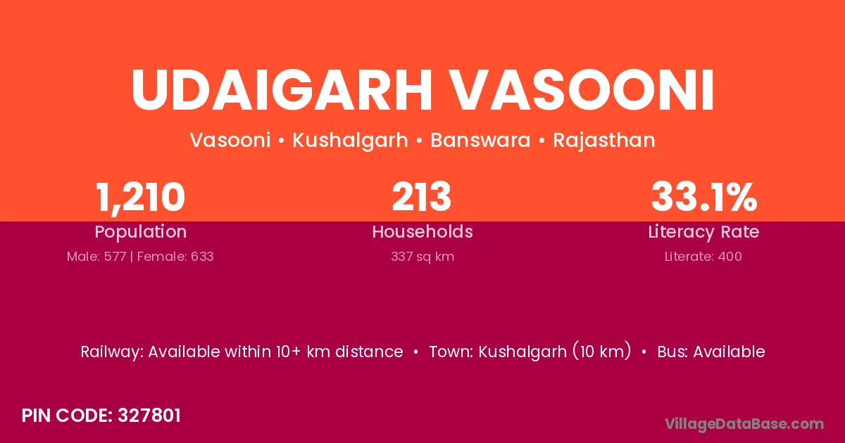 Udaigarh Vasooni village has a total population of 1,210 people, of which 577 are males and 633 are females.
