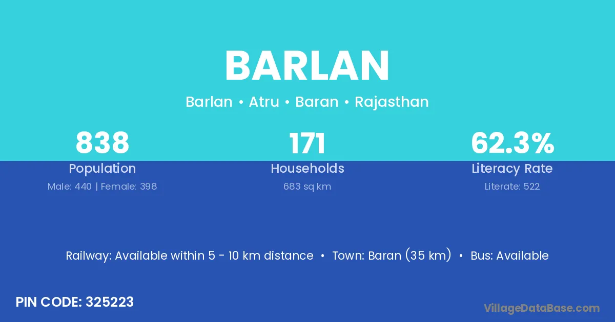 Baran (35 km) is the nearest town to Barlan village for major economic activities and is located approximately 35 km away.