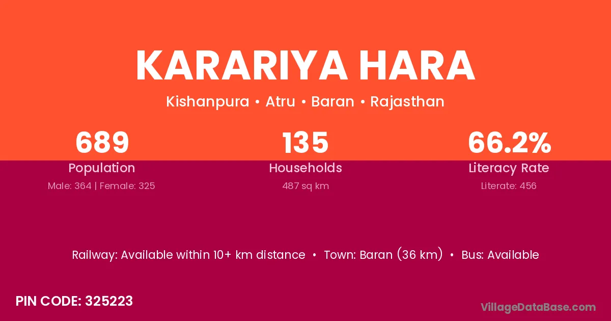 Baran (36 km) is the nearest town to Karariya Hara village for major economic activities and is located approximately 36 km away.