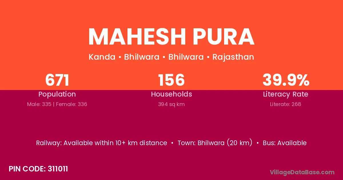 Baran (35 km) is the nearest town to Mahesh Pura village for major economic activities and is located approximately 35 km away.