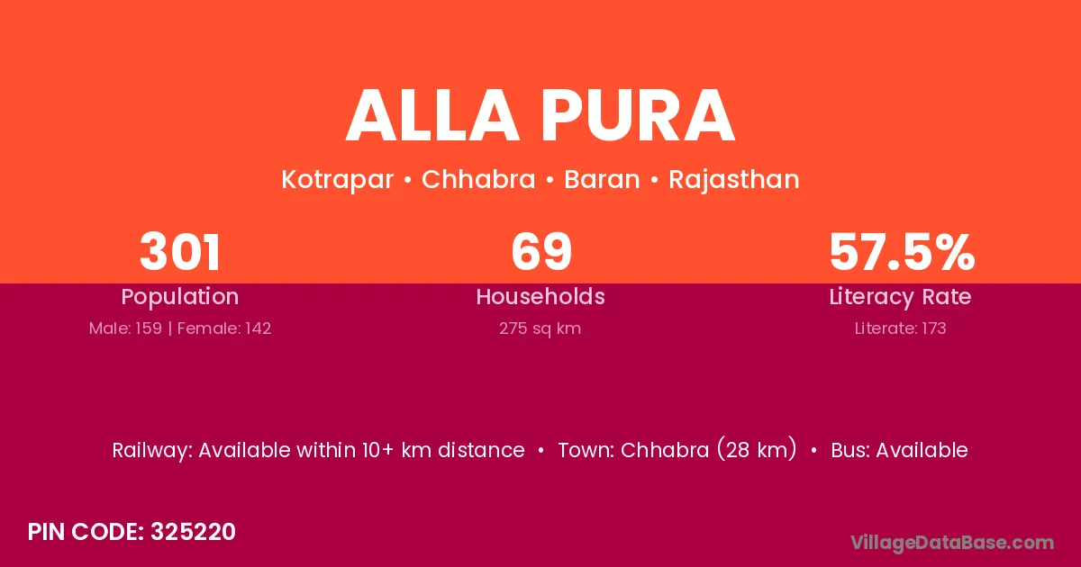 Chhabra (28 km) is the nearest town to Alla Pura village for major economic activities and is located approximately 28 km away.