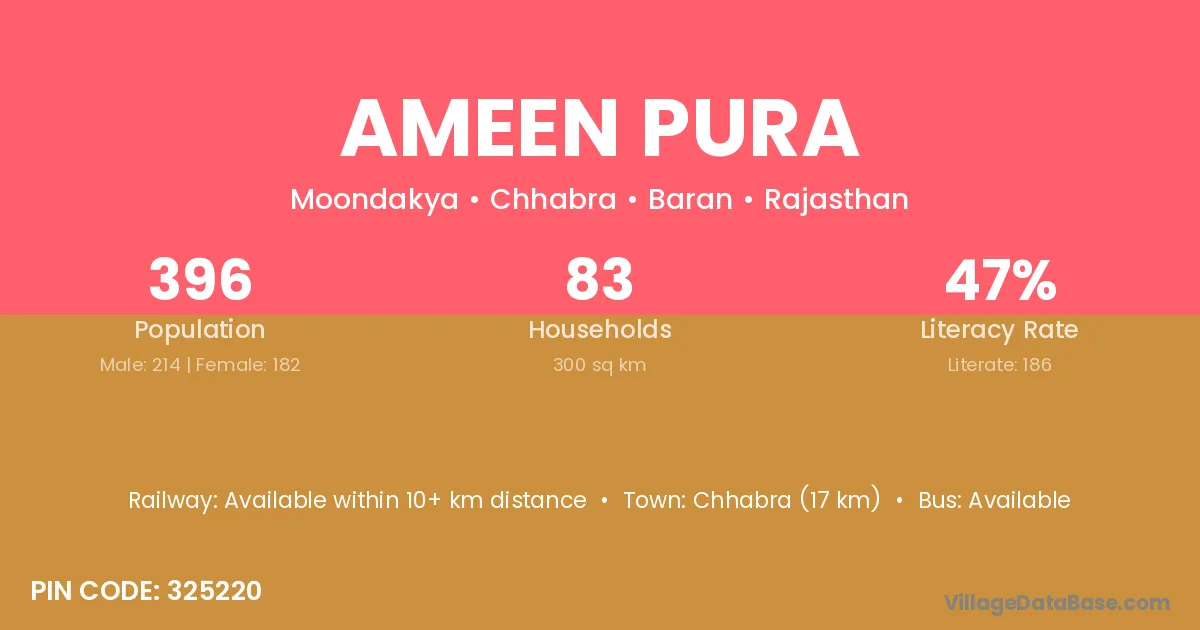 Chhabra (17 km) is the nearest town to Ameen Pura village for major economic activities and is located approximately 17 km away.