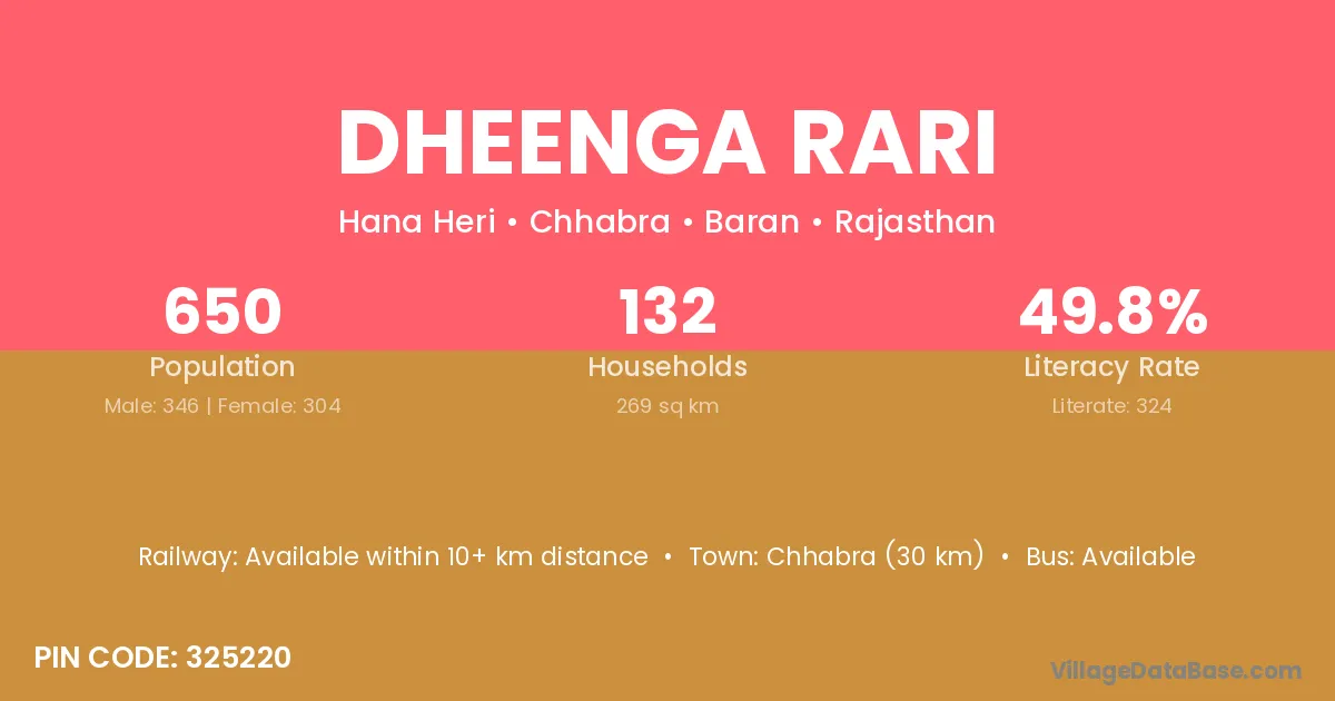 Dheenga Rari village has a total population of 650 people, of which 346 are males and 304 are females.