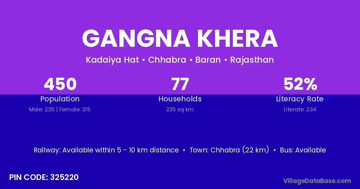 Chhabra (22 km) is the nearest town to Gangna Khera village for major economic activities and is located approximately 22 km away.