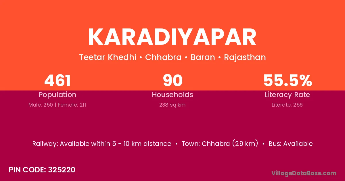 Chhabra (29 km) is the nearest town to Karadiyapar village for major economic activities and is located approximately 29 km away.