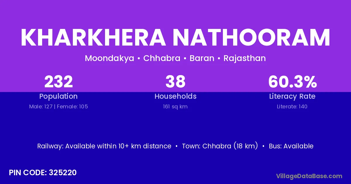 Chhabra (18 km) is the nearest town to Kharkhera Nathooram village for major economic activities and is located approximately 18 km away.