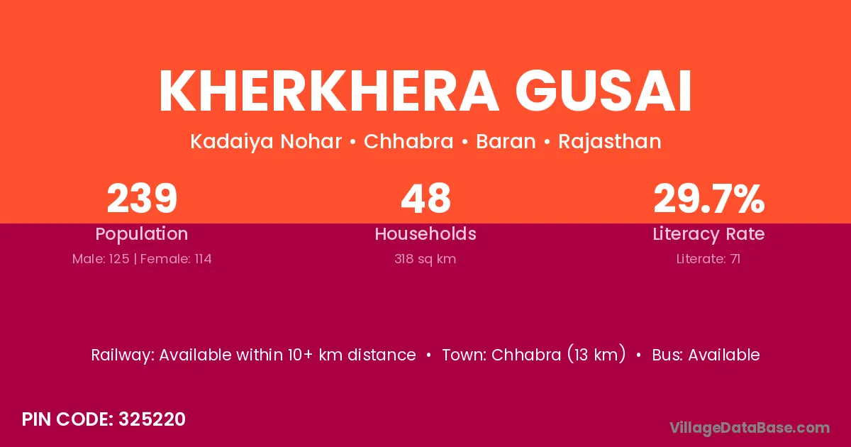 Chhabra (13 km) is the nearest town to Kherkhera Gusai village for major economic activities and is located approximately 13 km away.
