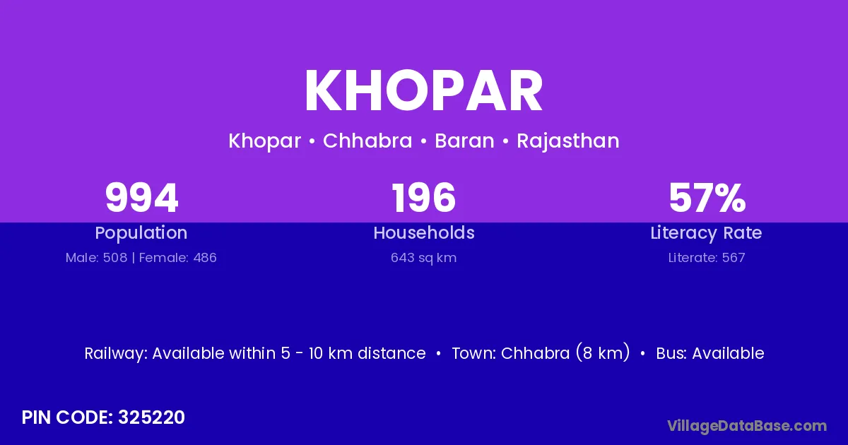 Chhabra (8 km) is the nearest town to Khopar village for major economic activities and is located approximately 8 km away.