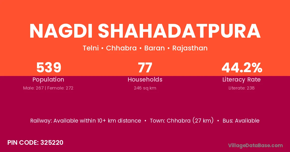 Chhabra (27 km) is the nearest town to Nagdi Shahadatpura village for major economic activities and is located approximately 27 km away.