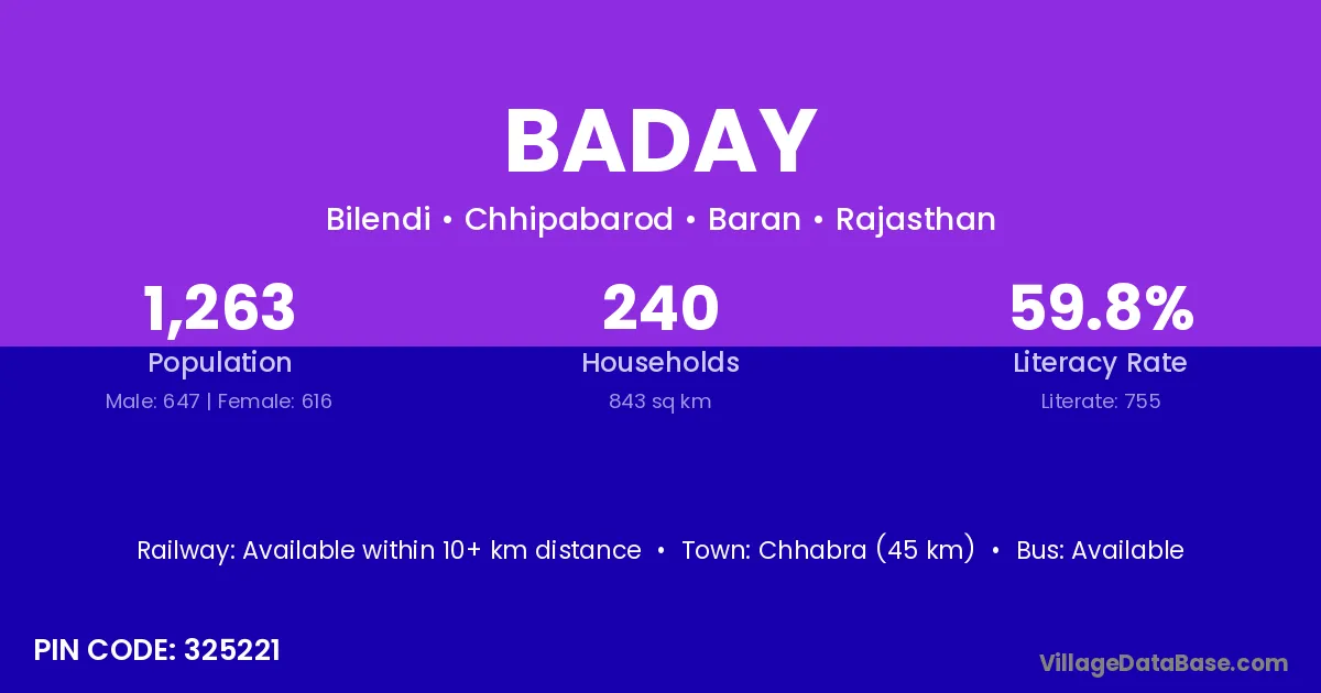 Chhabra (45 km) is the nearest town to Baday village for major economic activities and is located approximately 45 km away.